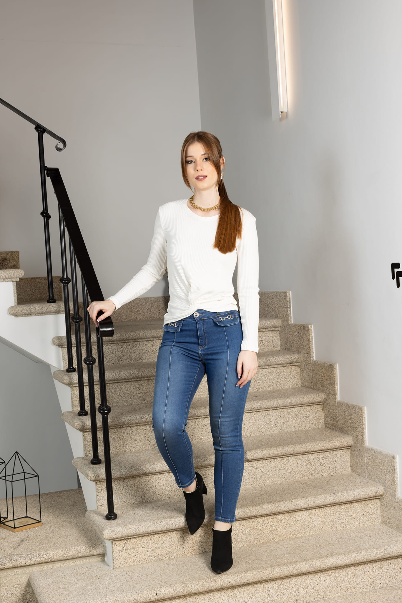 Calça de ganga seissa com palas na frente com 1 acessório. Fabricado em Portugal. Referência:|24SG00690