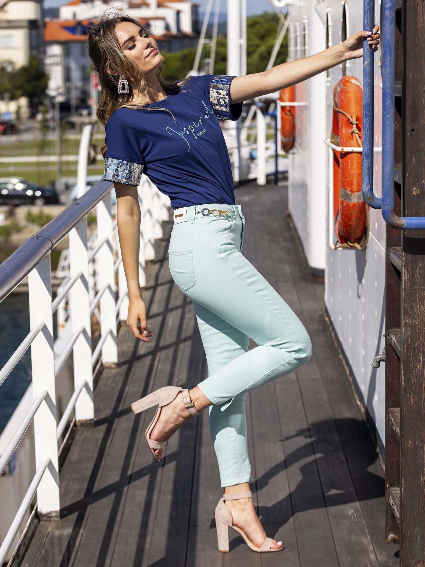 Desfrute do conforto e estilo com estas calças de senhora em branco e verde. Com uma aplicação na cintura para um toque de elegância adicional, estes bottoms apresentam cinco bolsos funcionais e uma cintura alta que realça a silhueta. O efeito push-up oferece um look moderno e favorecedor.Referência: V24SG00667