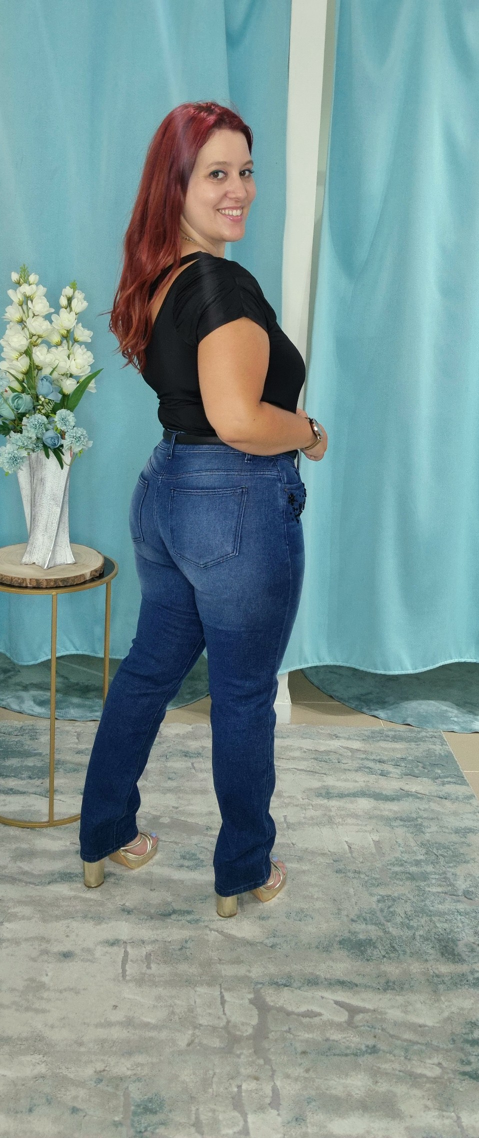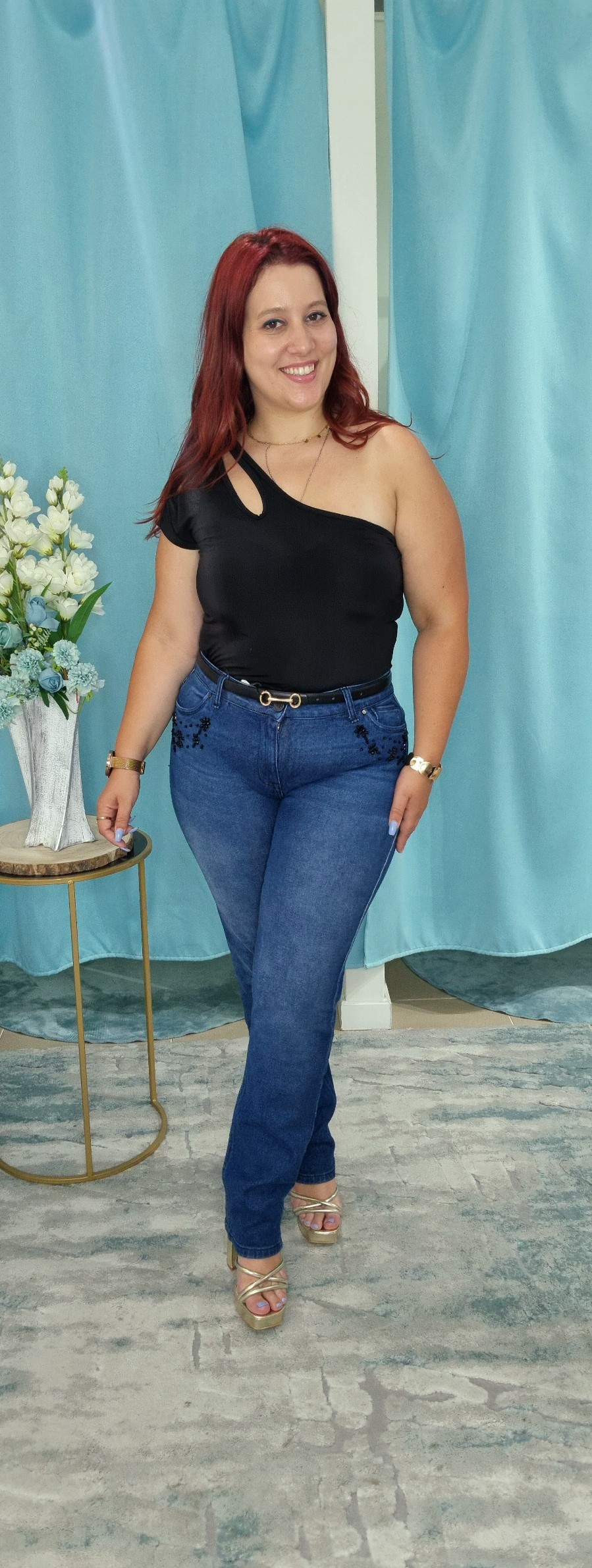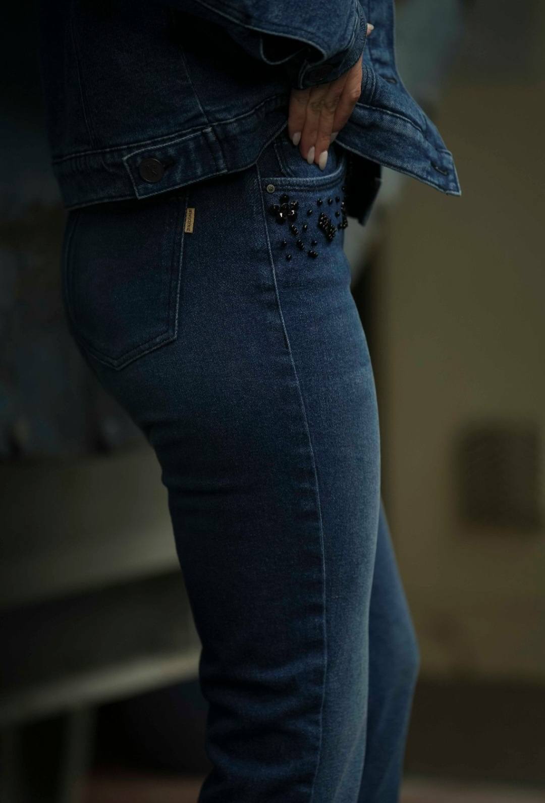 Calças de ganga de cintura média com presilhas. Modelo slim fit. Aplicação de pedraria e missangas na zona dos bolsos à frente. Três bolsos à frente e dois bolsos de chapa atrás. Fecha com botão e fecho de correr.Produzido em Portugal da marca Bigzone