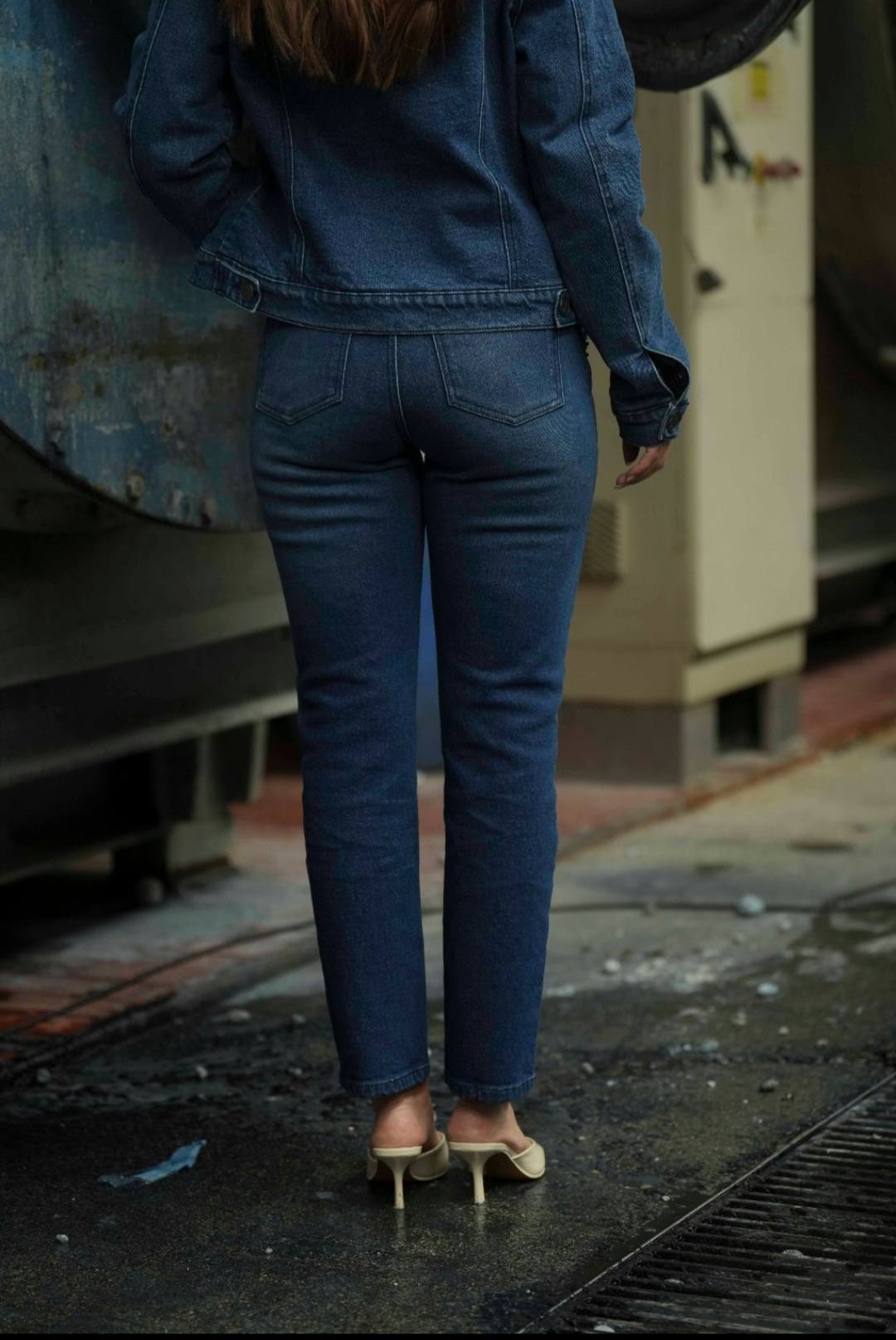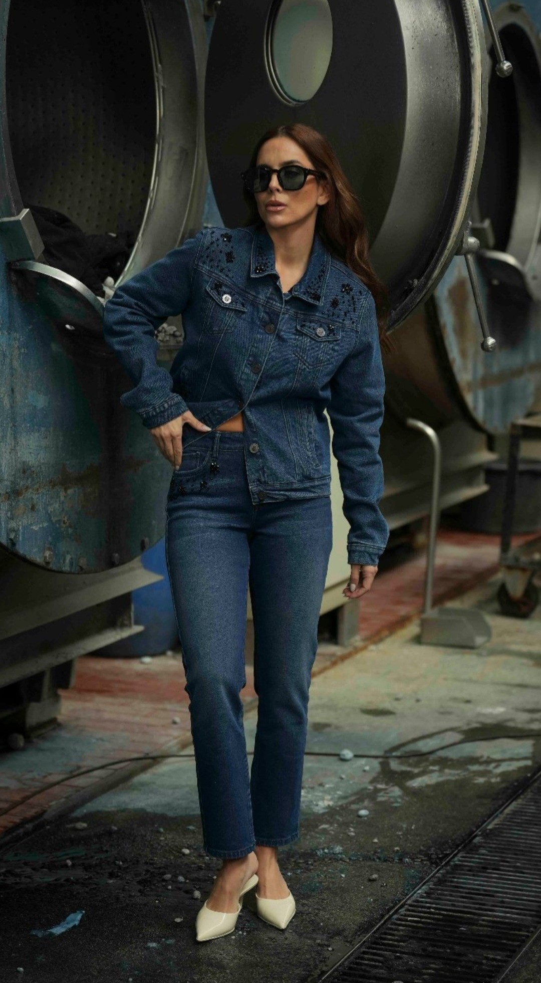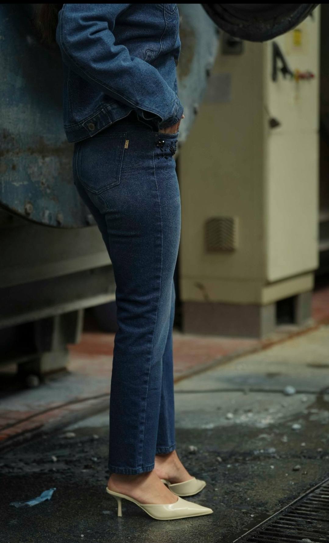 Calças de ganga de cintura média com presilhas. Modelo slim fit. Aplicação de pedraria e missangas na zona dos bolsos à frente. Três bolsos à frente e dois bolsos de chapa atrás. Fecha com botão e fecho de correr.Produzido em Portugal da marca Bigzone