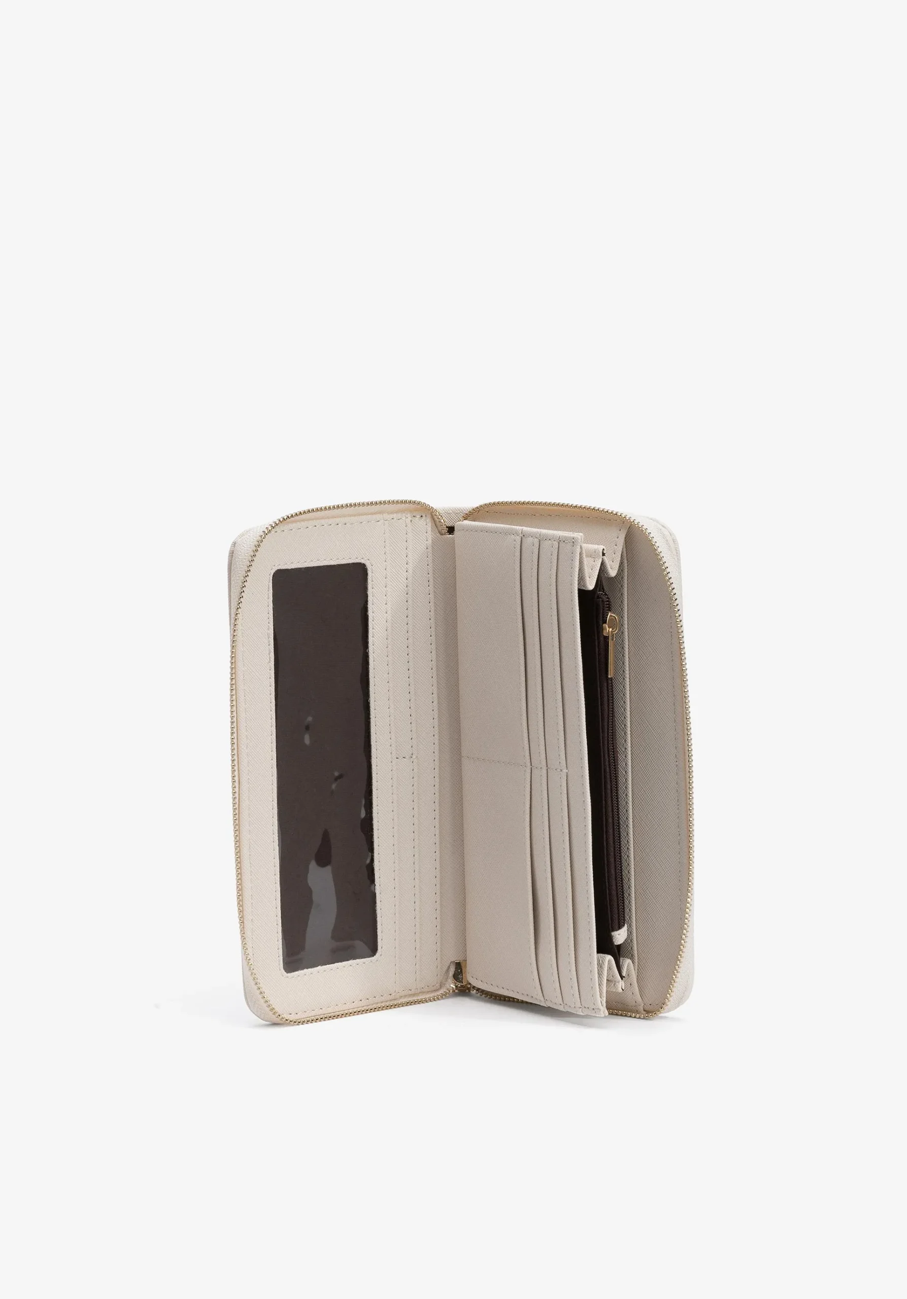 Porta-moedas com compartimentos interiores para cartões e bolso com fecho de correr para guardar moedas.