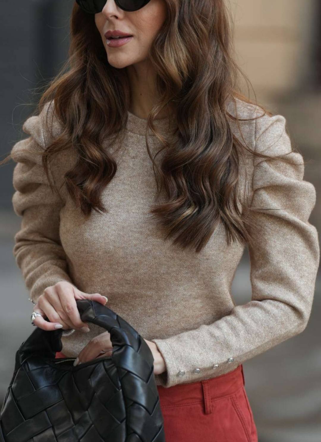 Camisola de malha com lurex. Numa malha muito suave. Decote redondo chegado ao pescoço. Plissada nos ombros. Mangas compridas com aplicação de botões dourados.Produzido em Portugal da marca Bigzone