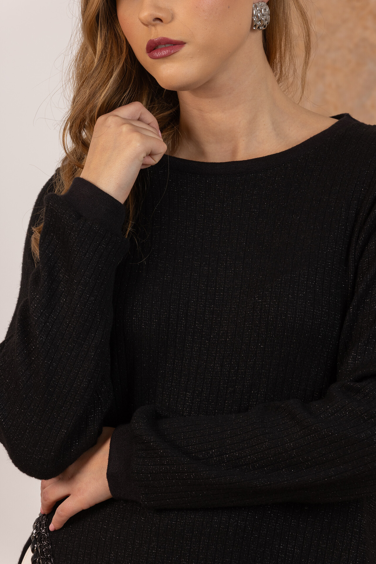 Sweat em malha preta com detalhe de brilho subtil e aplicação de franjas em pedras na barra. De corte moderno e versátil, proporciona conforto e elegância em qualquer ocasião, perfeito para conjugar com calças claras ou saias sofisticadas.Produzido em Portugal da marca Seissa
