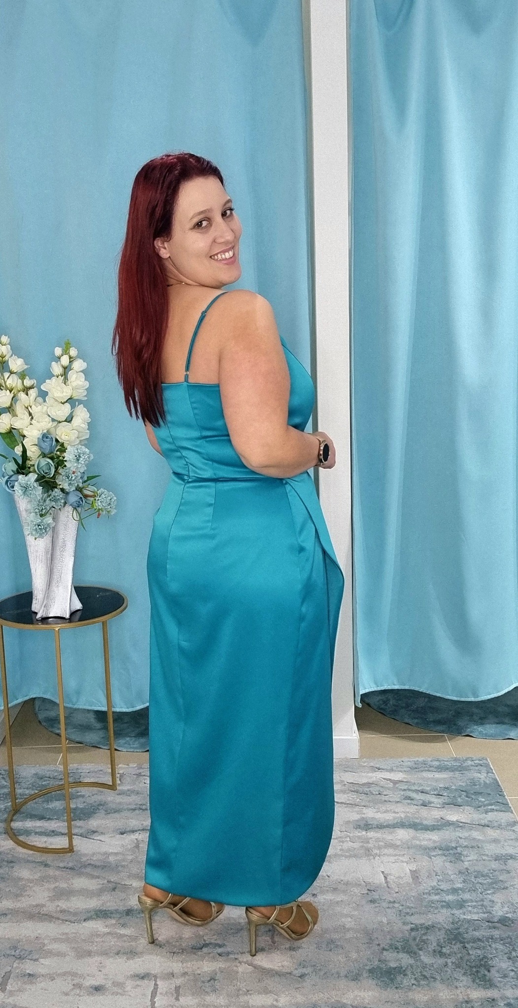 Vestido de alça, modelo cintado com um drapeado na cintura ,leva abertura na parte da frente e mais comprido na parte de tràs da marca Maria Carvalho,fecho na parte detrás, produzido em Portugal